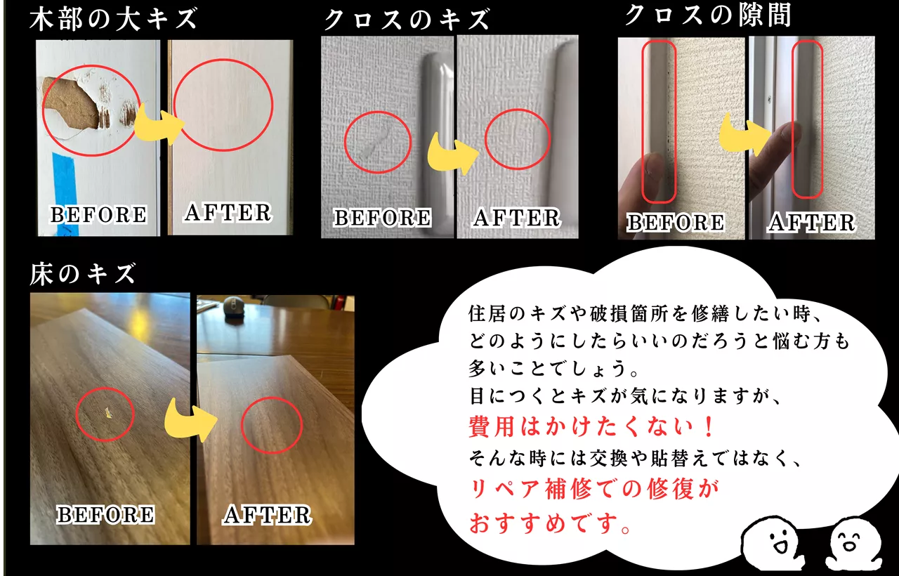 フローリングや木部、アルミサッシの傷を「貼り替えず」にリペア補修にて復元。熟練の職人が木目や光沢まで厳密に再現し、まるで新品かのように美しく修復します。